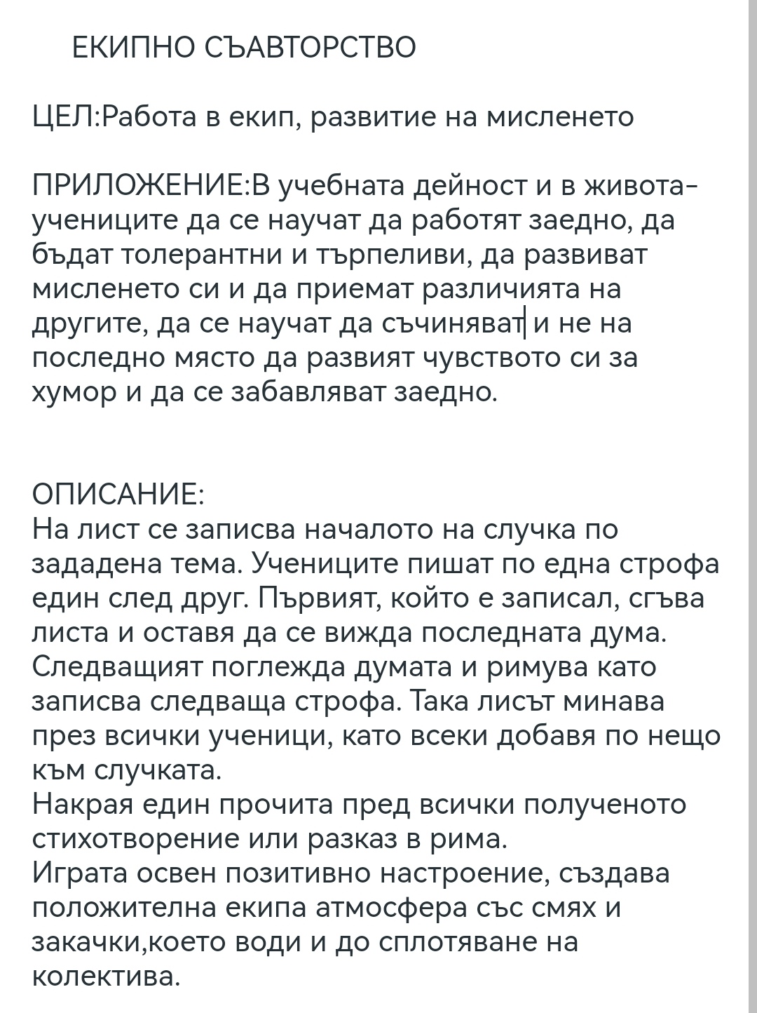 Идеята на занятието е да сплоти учениците и да изглади отношенията им.Слагайки всички ръчички в един проект, те индиректно се чувстват по-сплотени и усещат близостта на съучениците си.