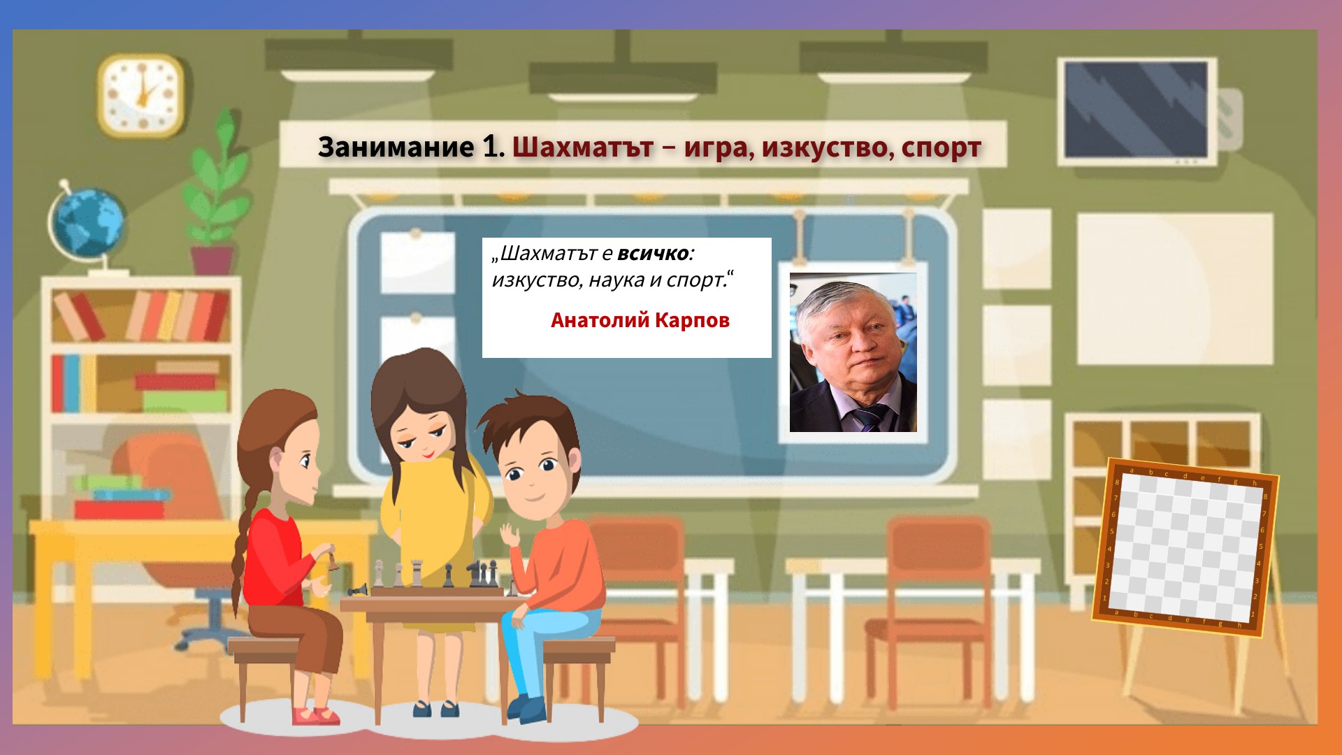 Занимание 1. Шахматът - игра, изкуство, спорт 07/27/2021 Учителят запознава учениците с шахмата като игра, изкуство и спорт. Заниманието е разработено за два учебни часа - в първия се усвояват нови знания, а във втория се практикува наученото.
